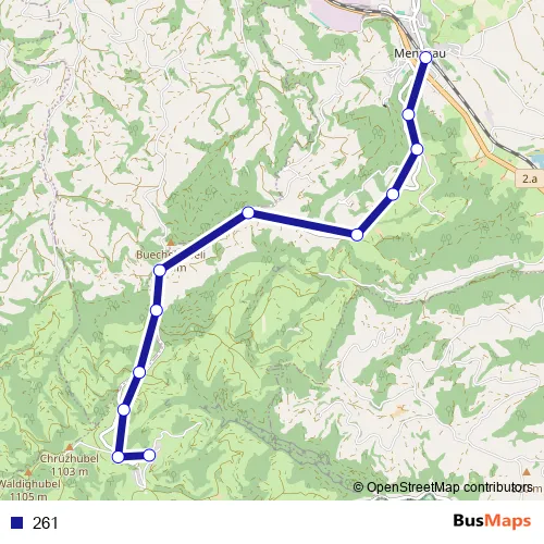 The first stop of the 261 bus route is Menzberg, Dorfplatz and the last stop is Menznau, Bahnhof. 261 is operational during tous les jours.