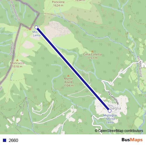 The first stop of the 2660 cable-car route is Monte Lema and the last stop is Miglieglia (Funivia). 2660 is operational during tous les jours.