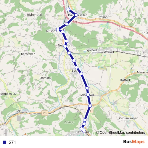 The first stop of the 271 bus route is Willisau, Bahnhof and the last stop is Dagmersellen, Bahnhof. 271 is operational during tous les jours.