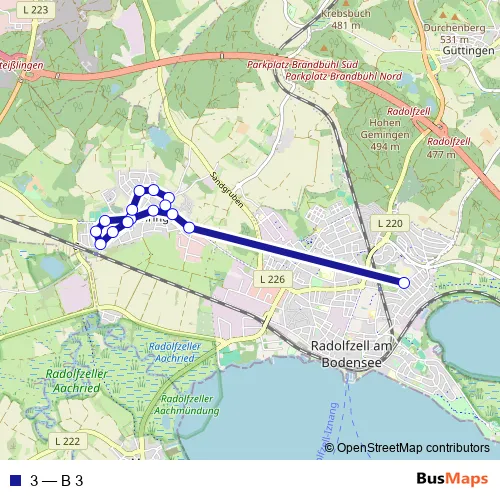 The first stop of the 3 bus route is Radolfzell, Gymnasium and the last stop is Böhringen (KN), Schule. 3 (B 3) is operational during en semaine.