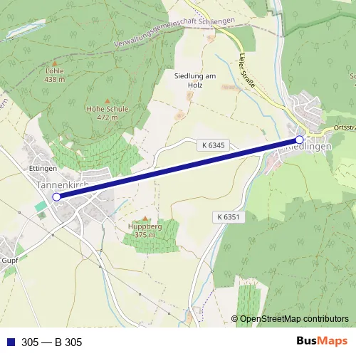 The first stop of the 305 bus route is Riedlingen, Milchhaus and the last stop is Tannenkirch, Kinderschule. 305 (B 305) is operational during en semaine.