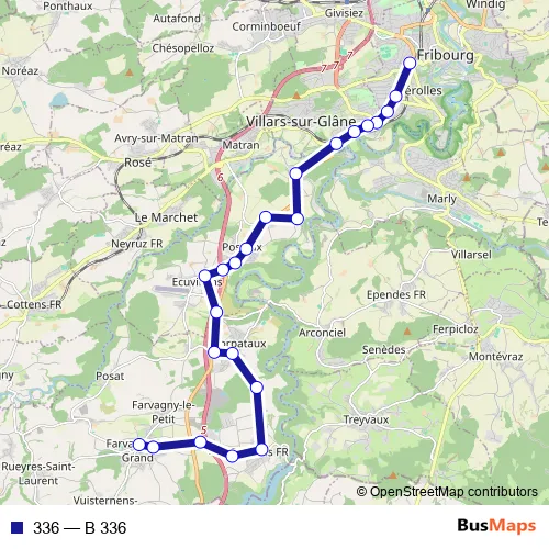 The first stop of the 336 bus route is Fribourg/Freiburg, gare rout. and the last stop is Farvagny-le-Grand, centre. 336 (B 336) is operational during en semaine.