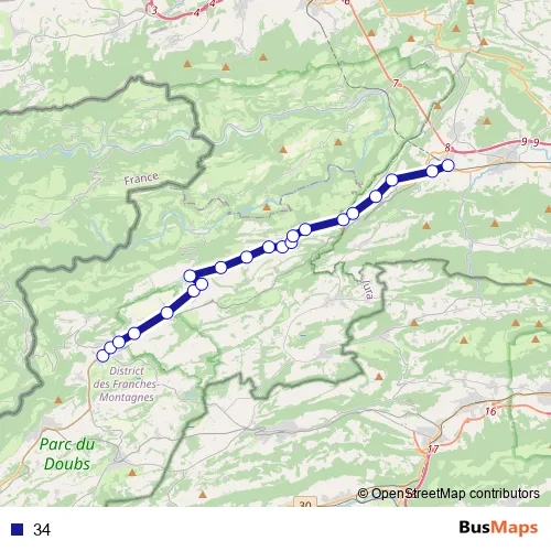 The first stop of the 34 bus route is Saignelégier, gare and the last stop is Glovelier, gare. 34 is operational during tous les jours.