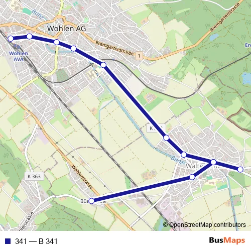 The first stop of the 341 bus route is Wohlen AG, Bahnhof and the last stop is Waltenschwil, Büelisacker. 341 (B 341) is operational during tous les jours.
