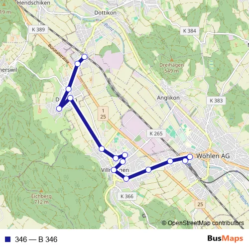 The first stop of the 346 bus route is Wohlen AG, Bahnhof and the last stop is Dottikon-Dintikon, Bahnhof. 346 (B 346) is operational during en semaine.