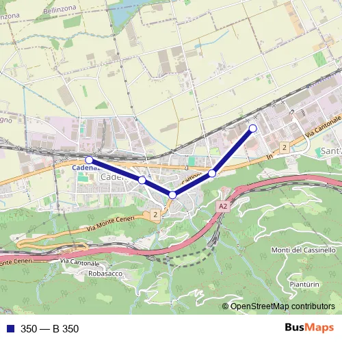 The first stop of the 350 bus route is S. Antonino,Centri Commerciali and the last stop is Cadenazzo, Stazione. 350 (B 350) is operational during tous les jours.