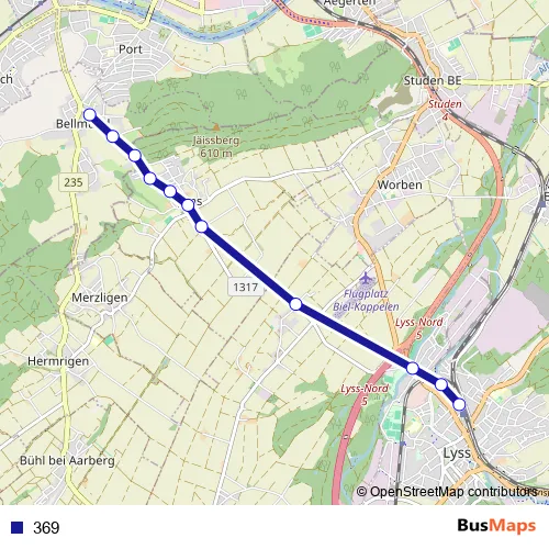 The first stop of the 369 bus route is Lyss, Bahnhof and the last stop is Bellmund, Kornfeld. 369 is operational during en semaine.