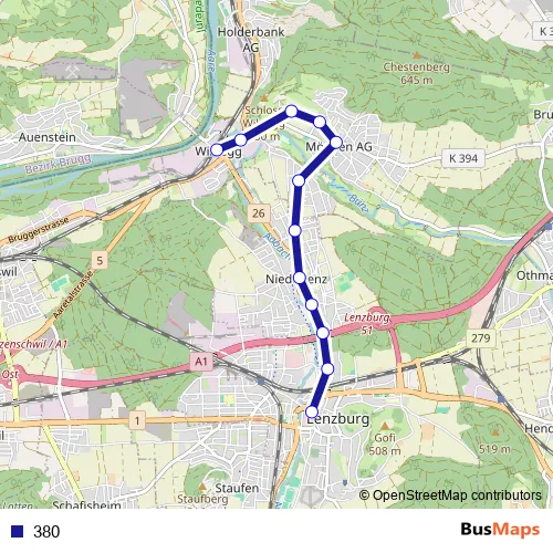 The first stop of the 380 bus route is Wildegg, Bahnhofplatz and the last stop is Lenzburg, Hypiplatz. 380 is operational during en semaine.