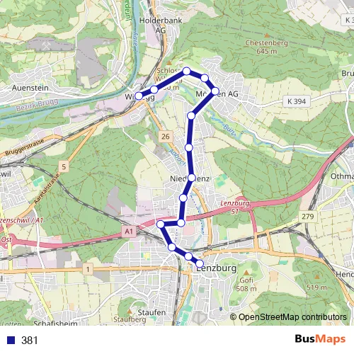 The first stop of the 381 bus route is Lenzburg, Hypiplatz and the last stop is Wildegg, Bahnhofplatz. 381 is operational during tous les jours.