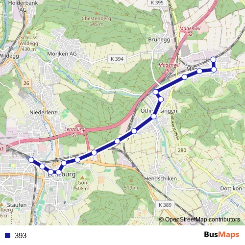 The first stop of the 393 bus route is Lenzburg, Bahnhof and the last stop is Mägenwil, Bahnhof. 393 is operational during tous les jours.