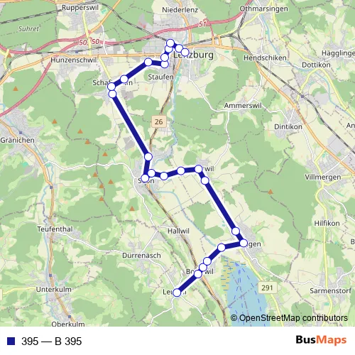The first stop of the 395 bus route is Leutwil, Dorfplatz and the last stop is Lenzburg, Hypiplatz. 395 (B 395) is operational during en semaine.