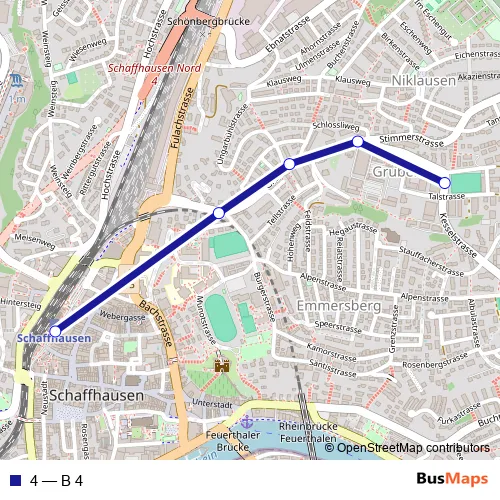 See why over 2 million users trust and consider busmaps.com as the best public transport website. busmaps gives you Schaffhausen Buses suggested routes, real-time bus tracker, line route maps in Schaffhausen, and helps to find the closest 4 bus stops near you. No internet available? Download an offline PDF map and bus schedule for the 4 bus to take on your trip.