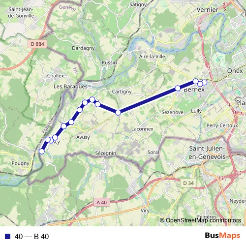 The first stop of the 40 bus route is Bernex, Vuillonnex and the last stop is Chancy, douane. 40 (B 40) is operational during tous les jours.