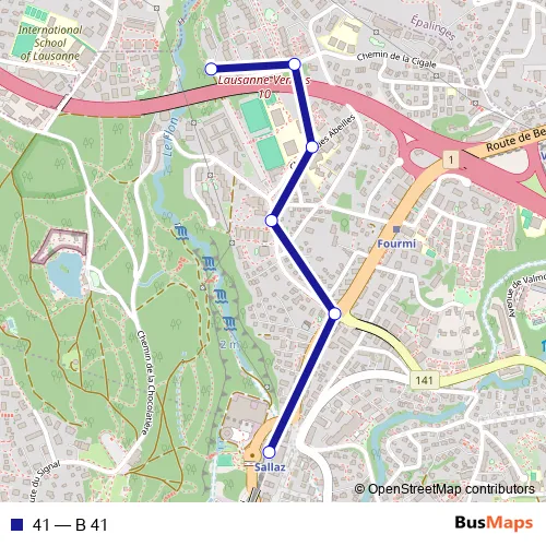 The first stop of the 41 bus route is Lausanne, Sallaz and the last stop is Lausanne, Montolieu. 41 (B 41) is operational during tous les jours.