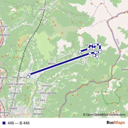 The first stop of the 448 bus route is Scareglia, Paese and the last stop is Tesserete, Stazione. 448 (B 448) is operational during tous les jours.