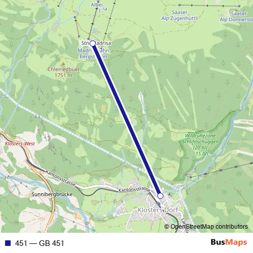 The first stop of the 451 cable-car route is Madrisa and the last stop is Klosters Dorf (Talst. Madrisa). 451 (GB 451) is operational during tous les jours.