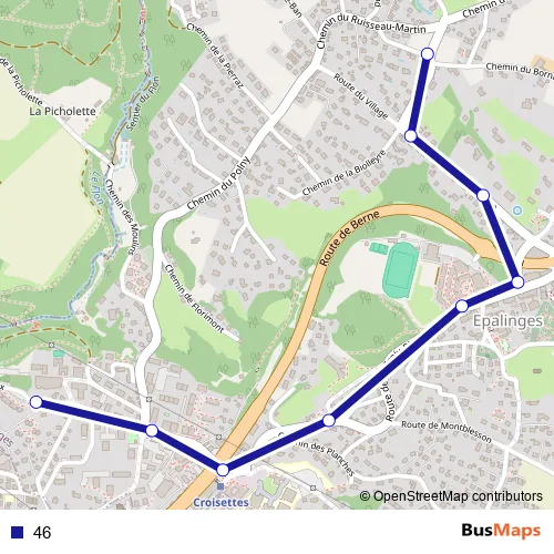 The first stop of the 46 bus route is Epalinges, Ballègue and the last stop is Epalinges, Bois-Murat. 46 is operational during tous les jours.
