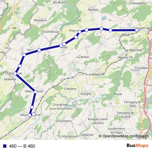 The first stop of the 460 bus route is Avry-Matran, gare and the last stop is Villaz-St-Pierre, gare. 460 (B 460) is operational during tous les jours.