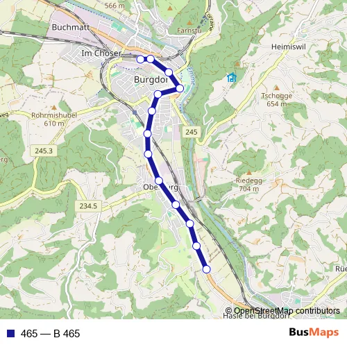The first stop of the 465 bus route is Burgdorf, Bahnhof and the last stop is Tschamerie. 465 (B 465) is operational during tous les jours.