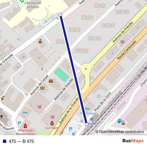 The first stop of the 475 bus route is Moudon, L'Ochette and the last stop is Moudon, gare. 475 (B 475) is operational during en semaine.