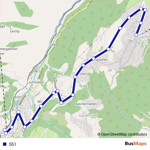 The first stop of the 551 bus route is St. Niklaus VS, Bahnhof and the last stop is Grächen, Zentrum. 551 is operational during tous les jours.
