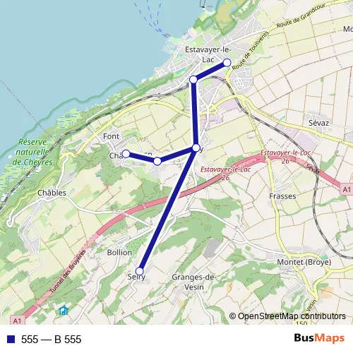 The first stop of the 555 bus route is Seiry, village and the last stop is Estavayer-le-Lac, Co. 555 (B 555) is operational during en semaine.