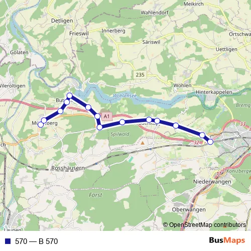 The first stop of the 570 bus route is Mühleberg, Post and the last stop is Bern Brünnen Westside, Bahnhof. 570 (B 570) is operational during tous les jours.