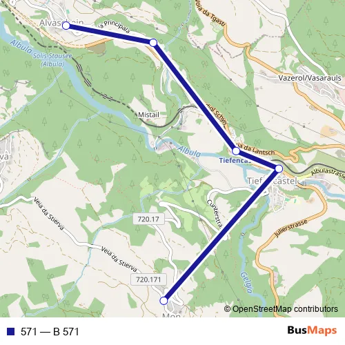 The first stop of the 571 bus route is Alvaschein, vischnanca and the last stop is Mon, avant porta. 571 (B 571) is operational during tous les jours.