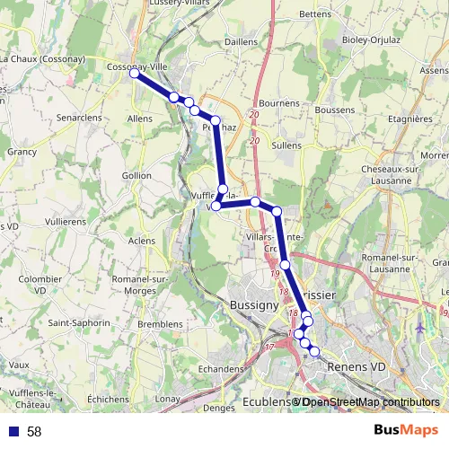 The first stop of the 58 bus route is Cossonay-Ville, centre and the last stop is Renens VD, gare. 58 is operational during tous les jours.