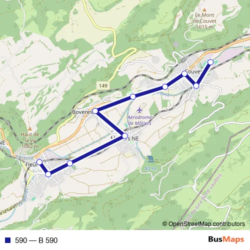 The first stop of the 590 bus route is Couvet, espaceval and the last stop is Fleurier, gare. 590 (B 590) is operational during en semaine.