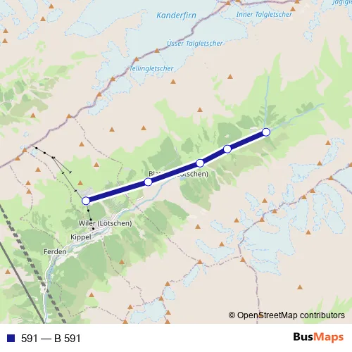 The first stop of the 591 bus route is Wiler (Lötschen), Lauchernalp and the last stop is
