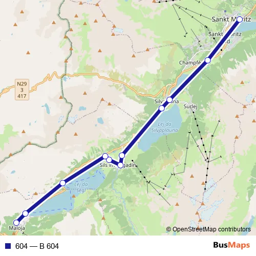 The first stop of the 604 bus route is Maloja, Posta and the last stop is St. Moritz, Bahnhof. 604 (B 604) is operational during tous les jours.