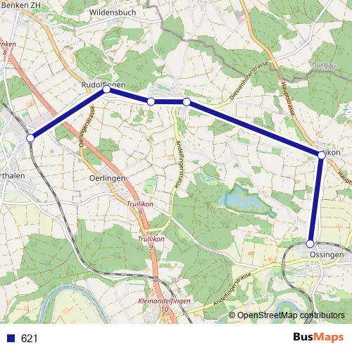 The first stop of the 621 bus route is Marthalen, Bahnhof and the last stop is Ossingen, Bahnhof. 621 is operational during tous les jours.