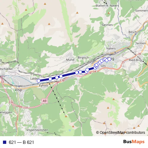 The first stop of the 621 bus route is Lalden, Dorf and the last stop is Glis, Saltina. 621 (B 621) is operational during tous les jours.