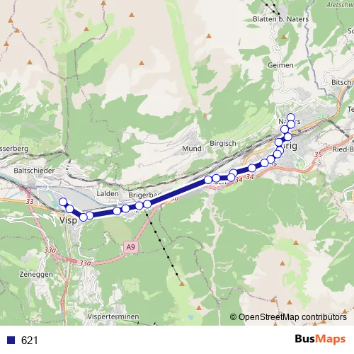 The first stop of the 621 bus route is Naters, Marktplatz and the last stop is Visp, Kleegärten. 621 is operational during tous les jours.