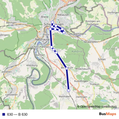 The first stop of the 630 bus route is Schaffhausen, Bahnhof and the last stop is Marthalen, Bahnhof. 630 (B 630) is operational during tous les jours.