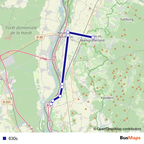 The first stop of the 630s bus route is Rheinweiler, Kapellengrün and the last stop is Müllheim (D), Goethestrasse. 630s is operational during en semaine.