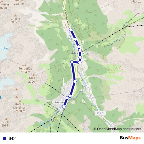 The first stop of the 642 bus route is Saas-Fee, Alpinexpress and the last stop is Bidermatten. 642 is operational during tous les jours.
