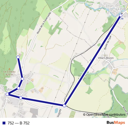 The first stop of the 752 bus route is Montricher,Fondation Michalski and the last stop is L'Isle, gare. 752 (B 752) is operational during le week-end.