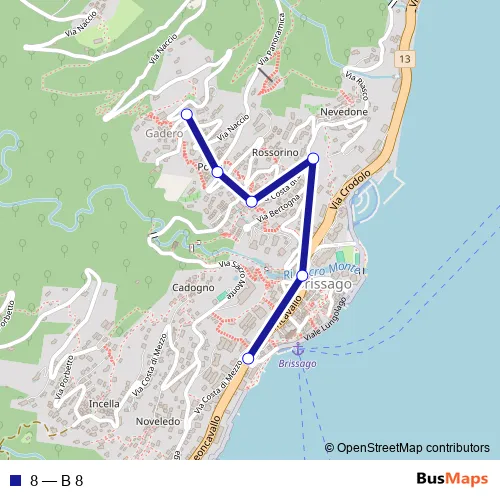 The first stop of the 8 bus route is Brissago, Posta and the last stop is Brissago, Gadero. 8 (B 8) is operational during tous les jours.