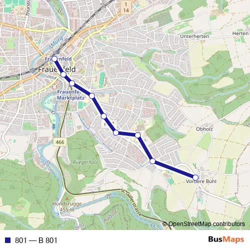The first stop of the 801 bus route is Frauenfeld, Bühl and the last stop is Frauenfeld, Bahnhof. 801 (B 801) is operational during tous les jours.