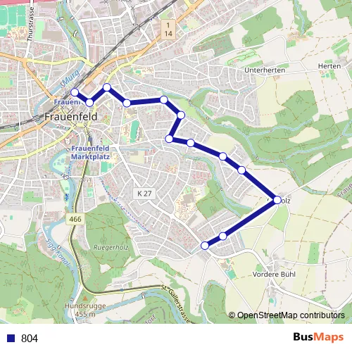 The first stop of the 804 bus route is Frauenfeld, Bahnhof and the last stop is Frauenfeld, Huben. 804 is operational during tous les jours.