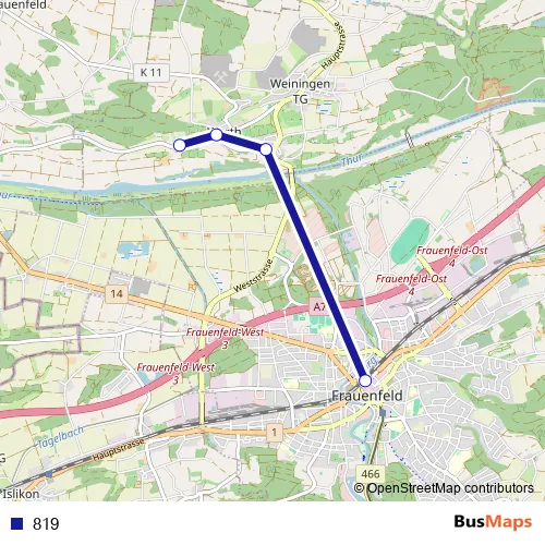 The first stop of the 819 bus route is Frauenfeld, Bahnhof and the last stop is Warth, Kartause Ittingen. 819 is operational during tous les jours.