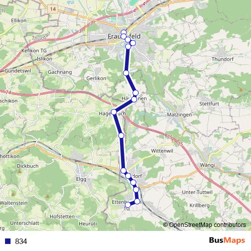 The first stop of the 834 bus route is Frauenfeld, Bahnhof and the last stop is Ettenhausen TG, Elggerstrasse. 834 is operational during tous les jours.