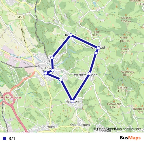 The first stop of the 871 bus route is Hinwil, Bahnhof and the last stop is Hinwil, Bahnhof. 871 is operational during tous les jours.