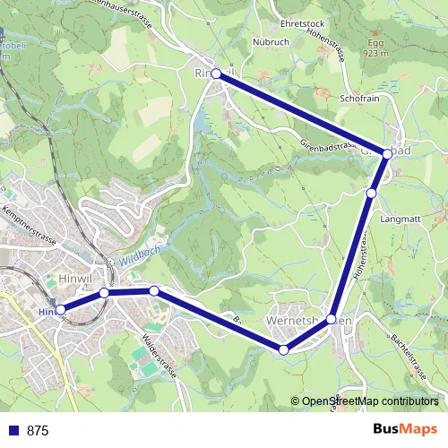 The first stop of the 875 bus route is Hinwil, Bahnhof and the last stop is Hinwil, Ringwil. 875 is operational during tous les jours.