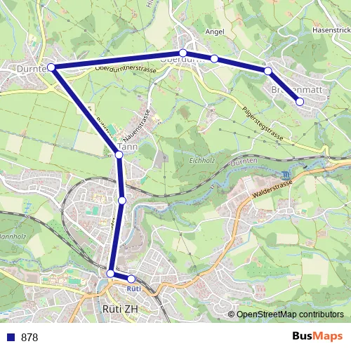 The first stop of the 878 bus route is Rüti ZH, Bahnhof and the last stop is Dürnten, J.-C.-Heerstrasse. 878 is operational during tous les jours.