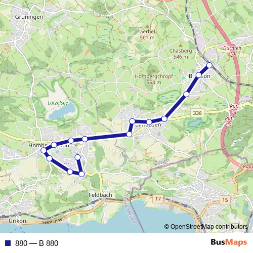 The first stop of the 880 bus route is Bubikon, Bahnhof and the last stop is Hombrechtikon, Krone. 880 (B 880) is operational during tous les jours.