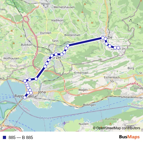 The first stop of the 885 bus route is Laupen ZH, Schulhaus and the last stop is Rapperswil SG, Bahnhof. 885 (B 885) is operational during tous les jours.