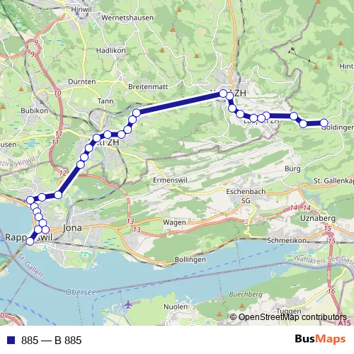 The first stop of the 885 bus route is Goldingen, Egligen and the last stop is Rapperswil SG, Bahnhof. 885 (B 885) is operational during tous les jours.